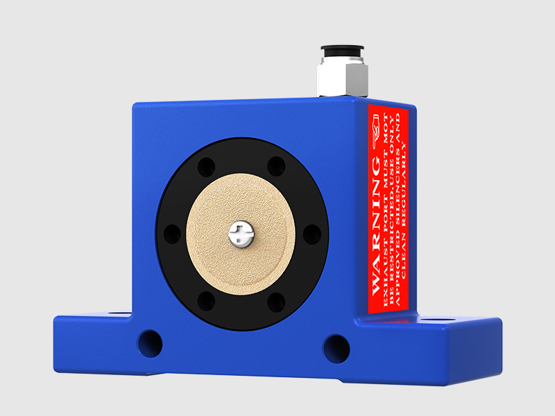 此小型氣動振動器設計簡單,但仍可給出很強的離心力。殼體由擠壓鋁加工而成,精制鋼滾在其中滾動。此鋼滾由兩片特制高抗沖擊塑料端蓋定位。在殼體上有兩個水平孔和兩個垂直孔,使安裝容易。空氣從相互垂直的兩個進氣孔中的一個進入。這兩個進氣孔為標準管螺紋。為堵住不用的一個進氣孔,隨機提供一個管塞。